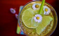 Wallpaper Carbonated drink with chunks of lime and daisies in a glass