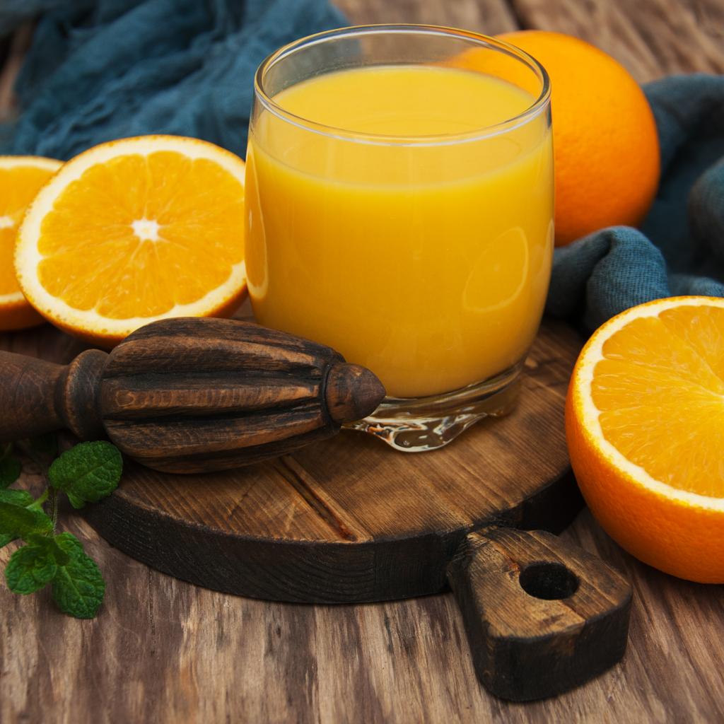 Wallpaper Glass of juice on a board with oranges