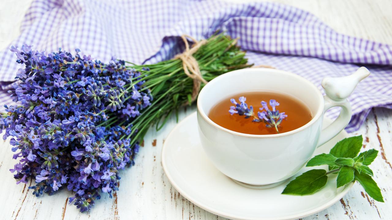 Wallpaper Cup of tea on the table with a bouquet of lavender