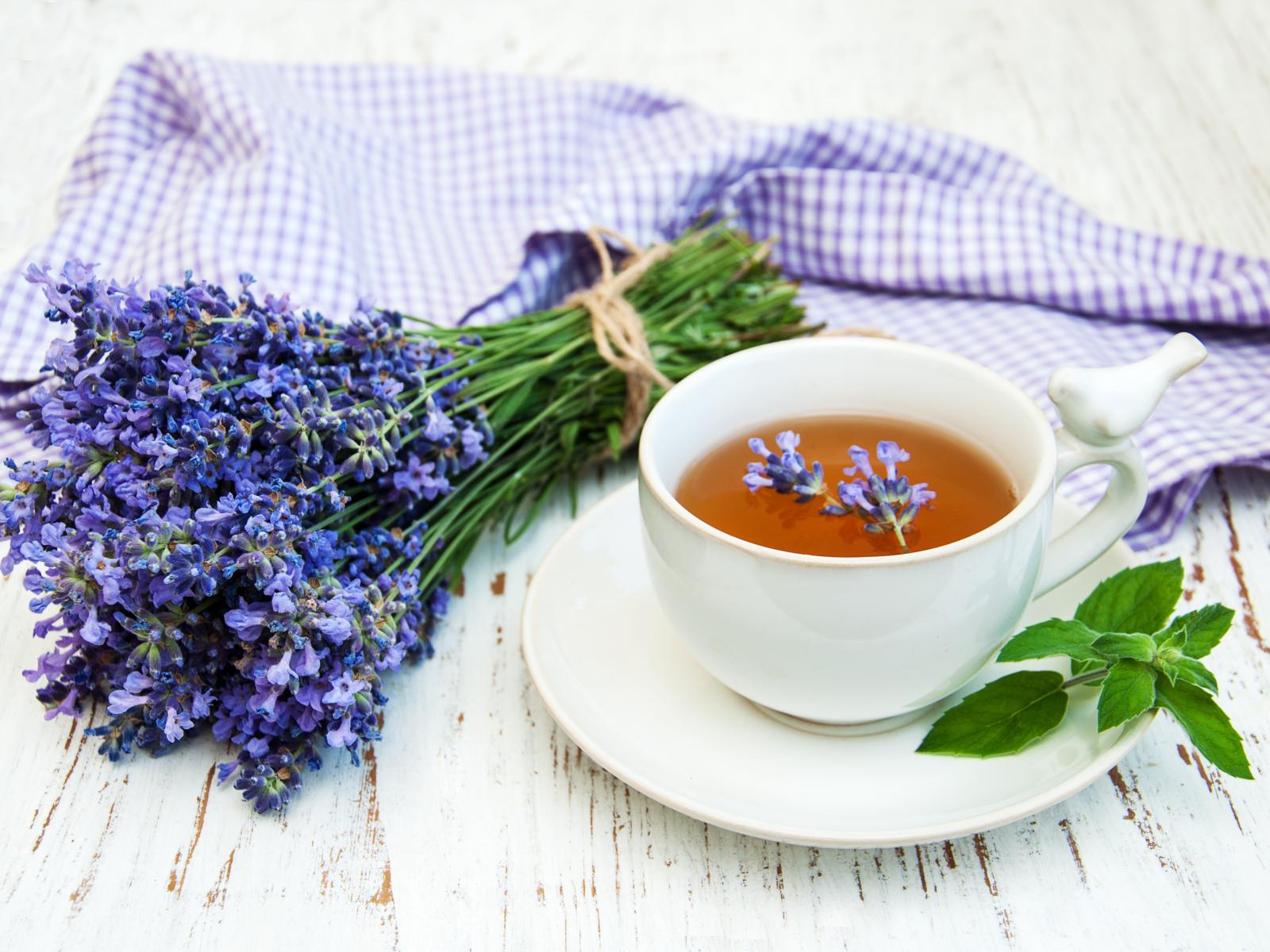 Wallpaper Cup of tea on the table with a bouquet of lavender