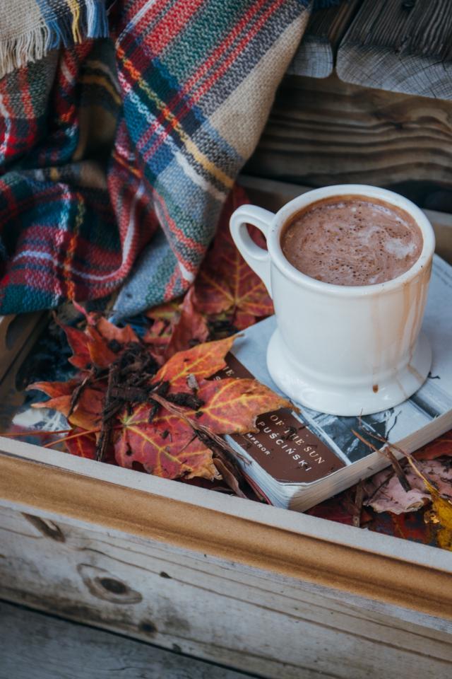 Wallpaper A cup of coffee stands on a book on the steps with a plaid