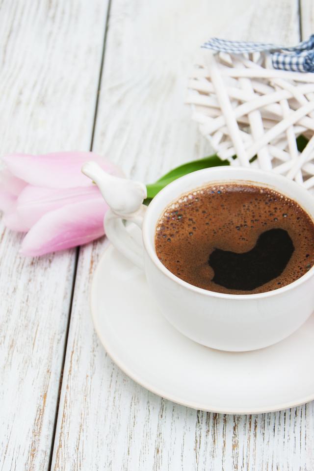 Wallpaper Cup of coffee on the table with pink tulips and wicker heart.