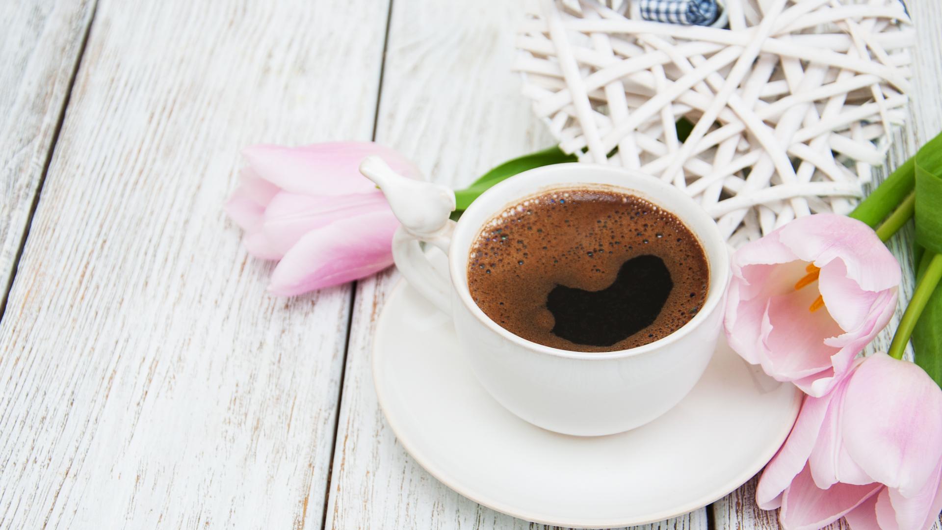 Wallpaper Cup of coffee on the table with pink tulips and wicker heart.