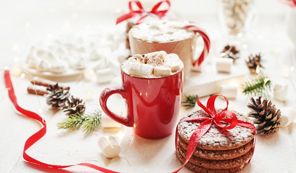 Wallpaper Cups of drink with marshmallows on a table with cookies