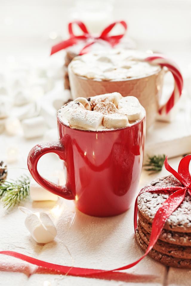 Wallpaper Cups of drink with marshmallows on a table with cookies