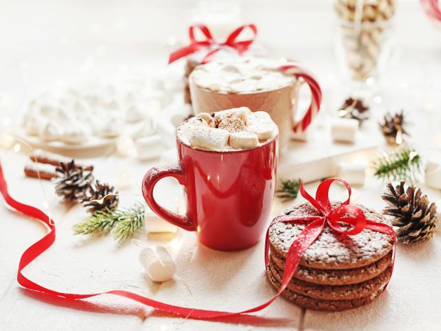 Wallpaper Cups of drink with marshmallows on a table with cookies