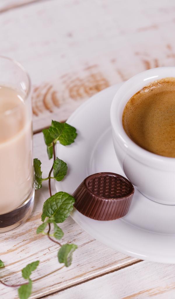 Wallpaper Hot coffee on a table with chocolate candy and cocoa
