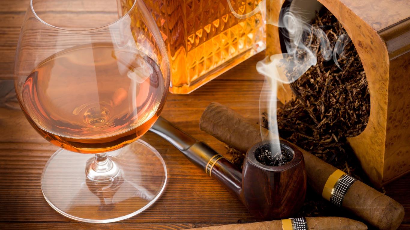 Wallpaper Glass of cognac on a table with a pipe and a cigar