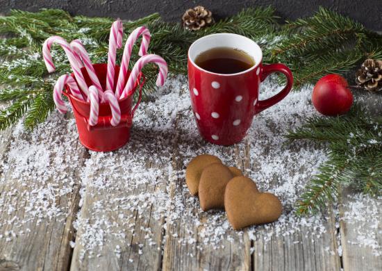 Wallpaper Cup of tea on a table with sweets, cookies and fir branches