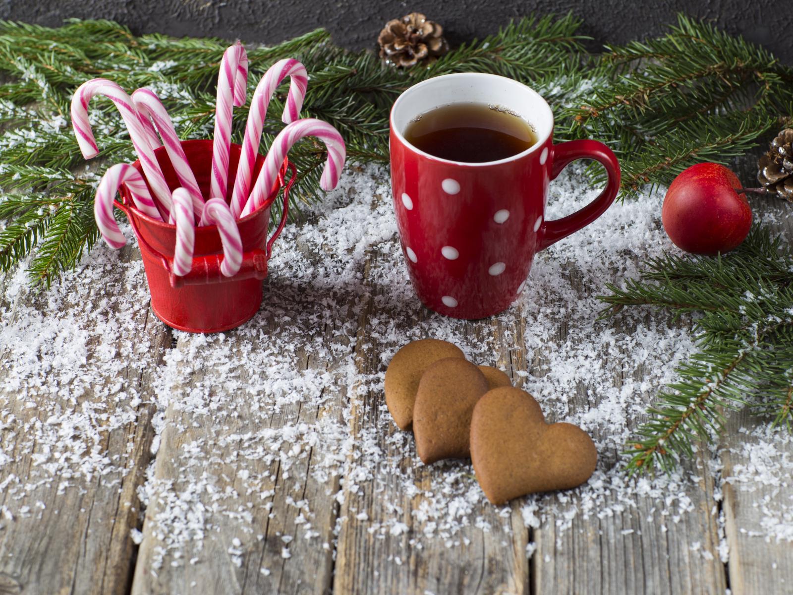 Wallpaper Cup of tea on a table with sweets, cookies and fir branches