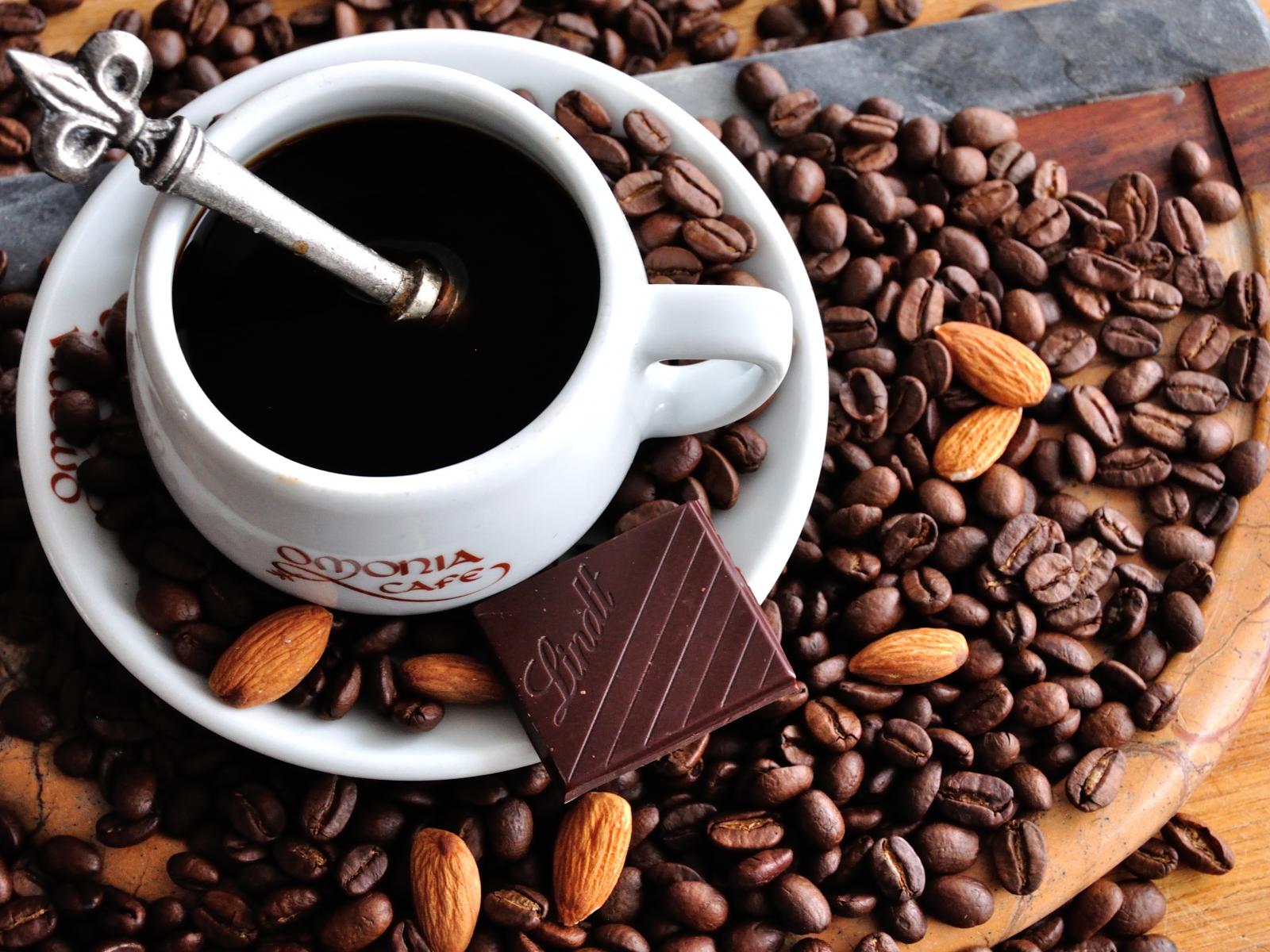 Wallpaper White cup of coffee on a table with coffee beans