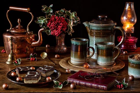 Wallpaper Tea party table with book and pastries.