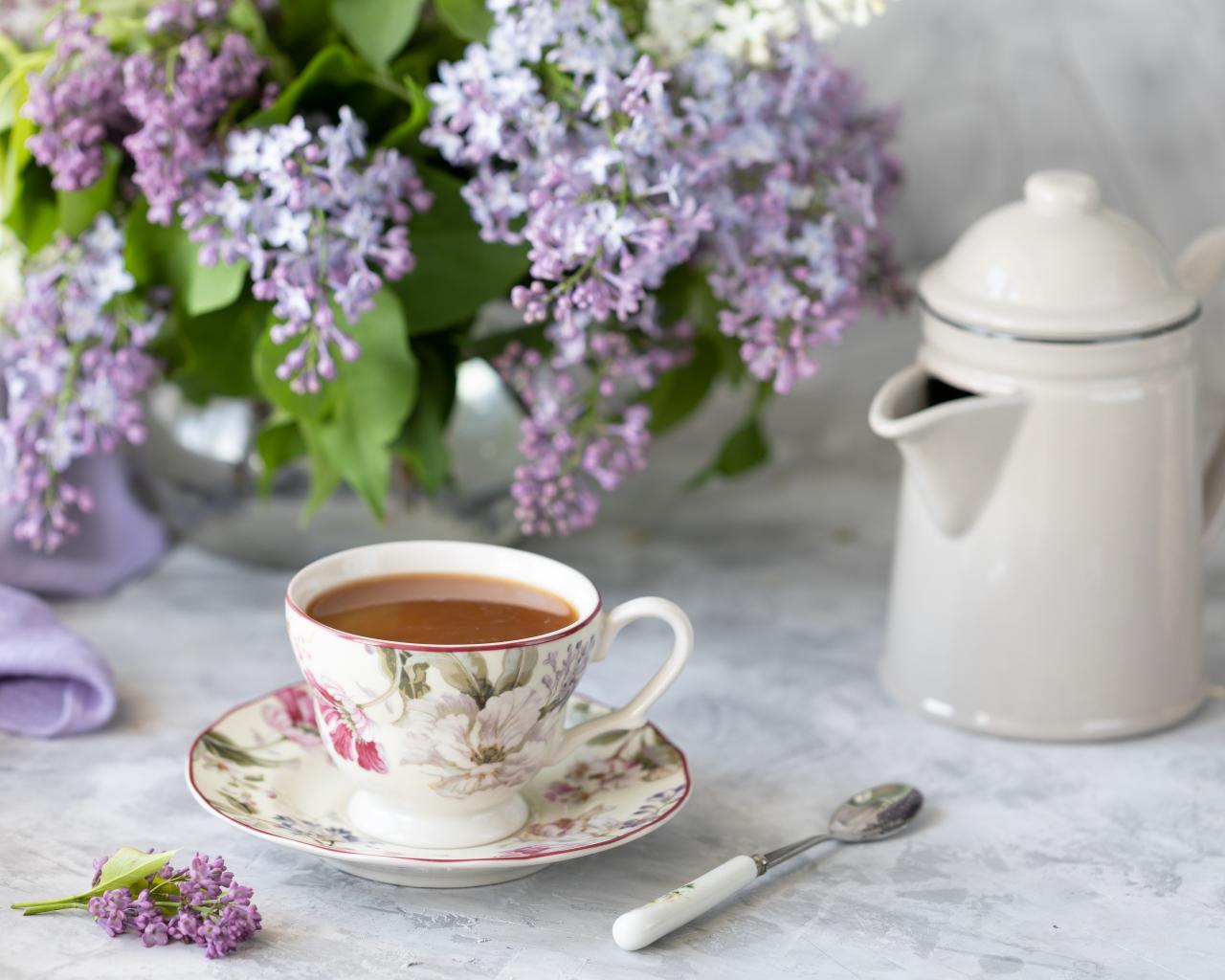 Wallpaper Cup of coffee with a teapot on a table with a bouquet of lilacs