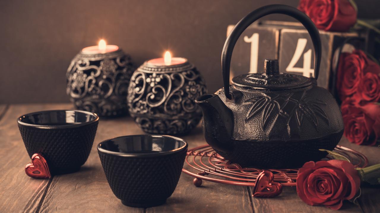 Wallpaper Two cups of tea on a table with candles and red roses