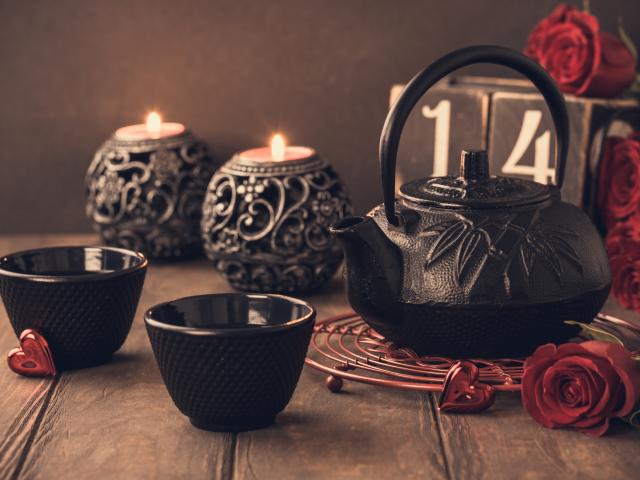 Wallpaper Two cups of tea on a table with candles and red roses