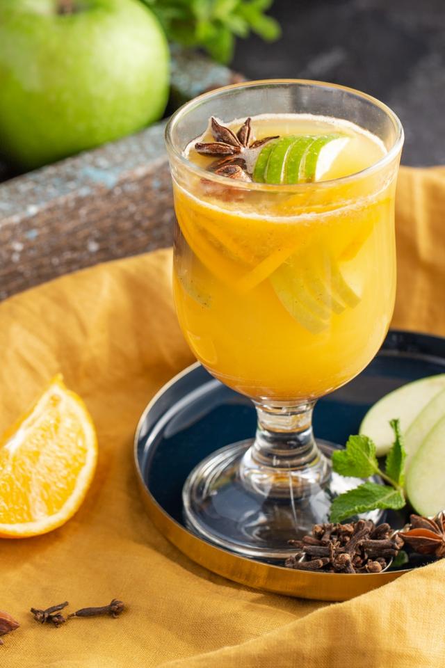 Wallpaper A glass of lemonade on a table with apples and cinnamon