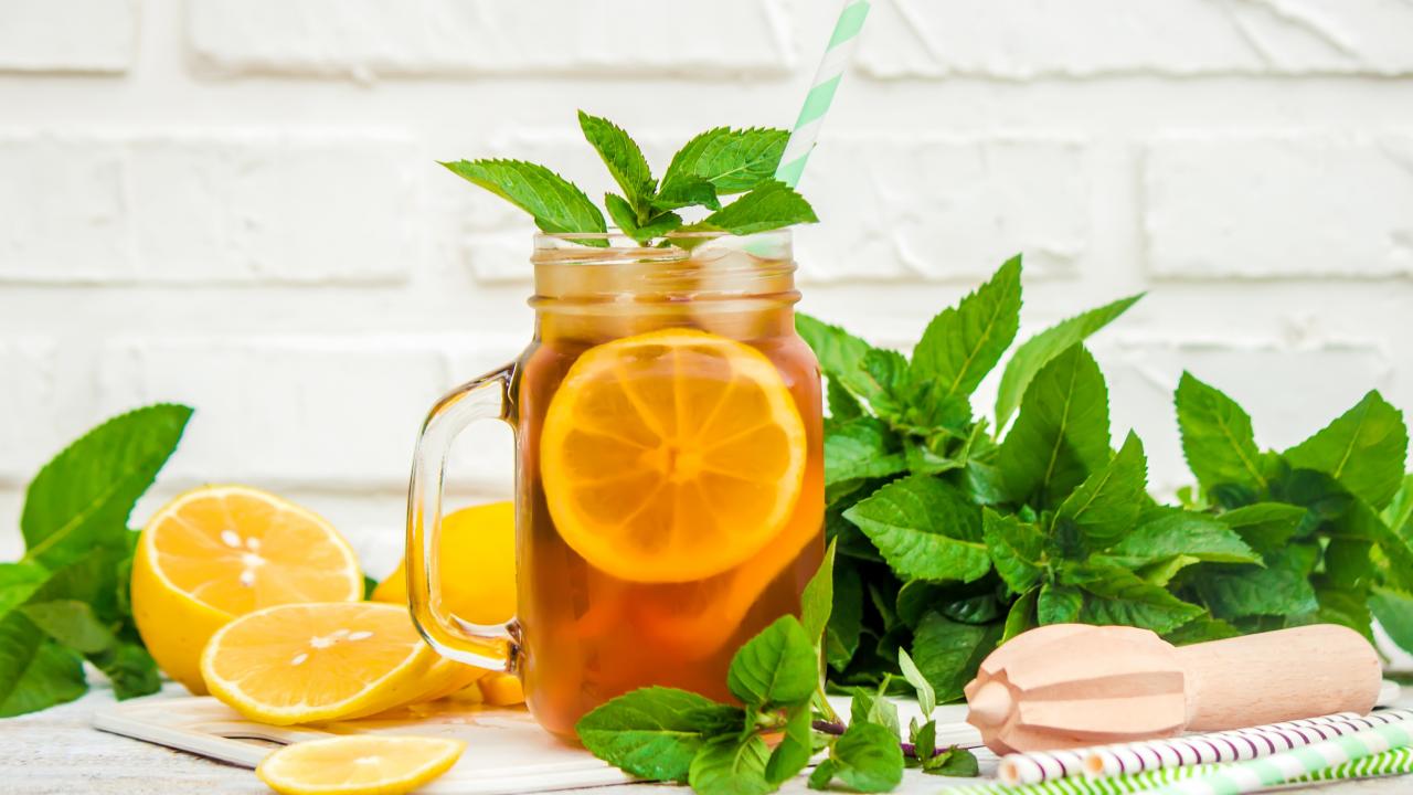 Wallpaper Lemonade on a table with lemon and mint leaves