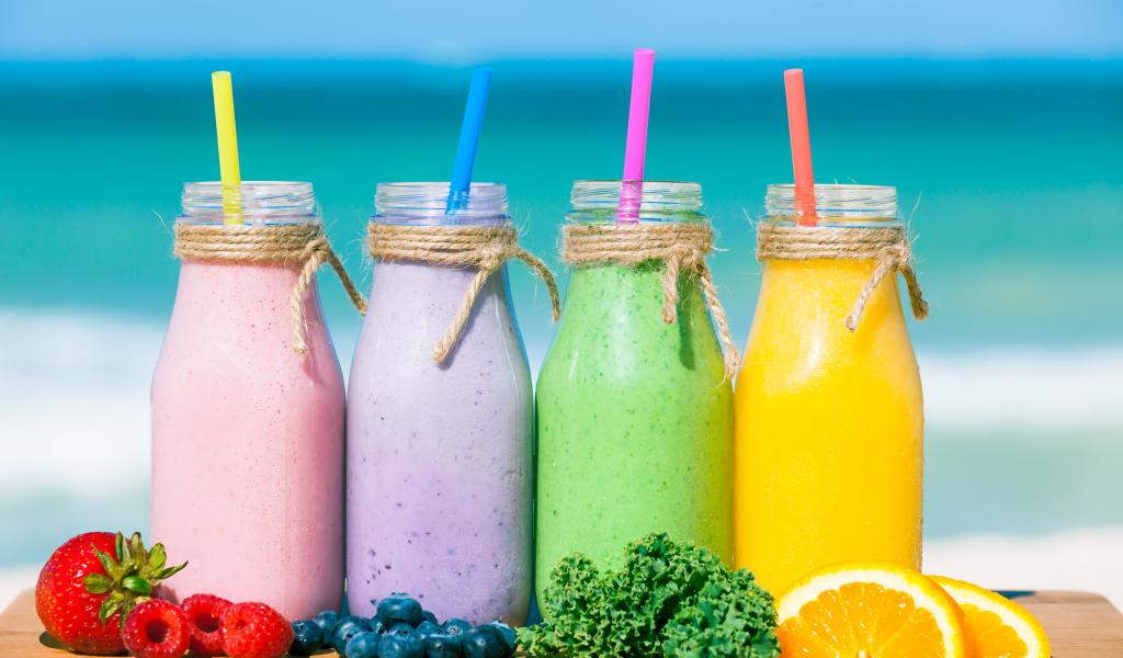 Wallpaper Three smoothie bottles on a beach table