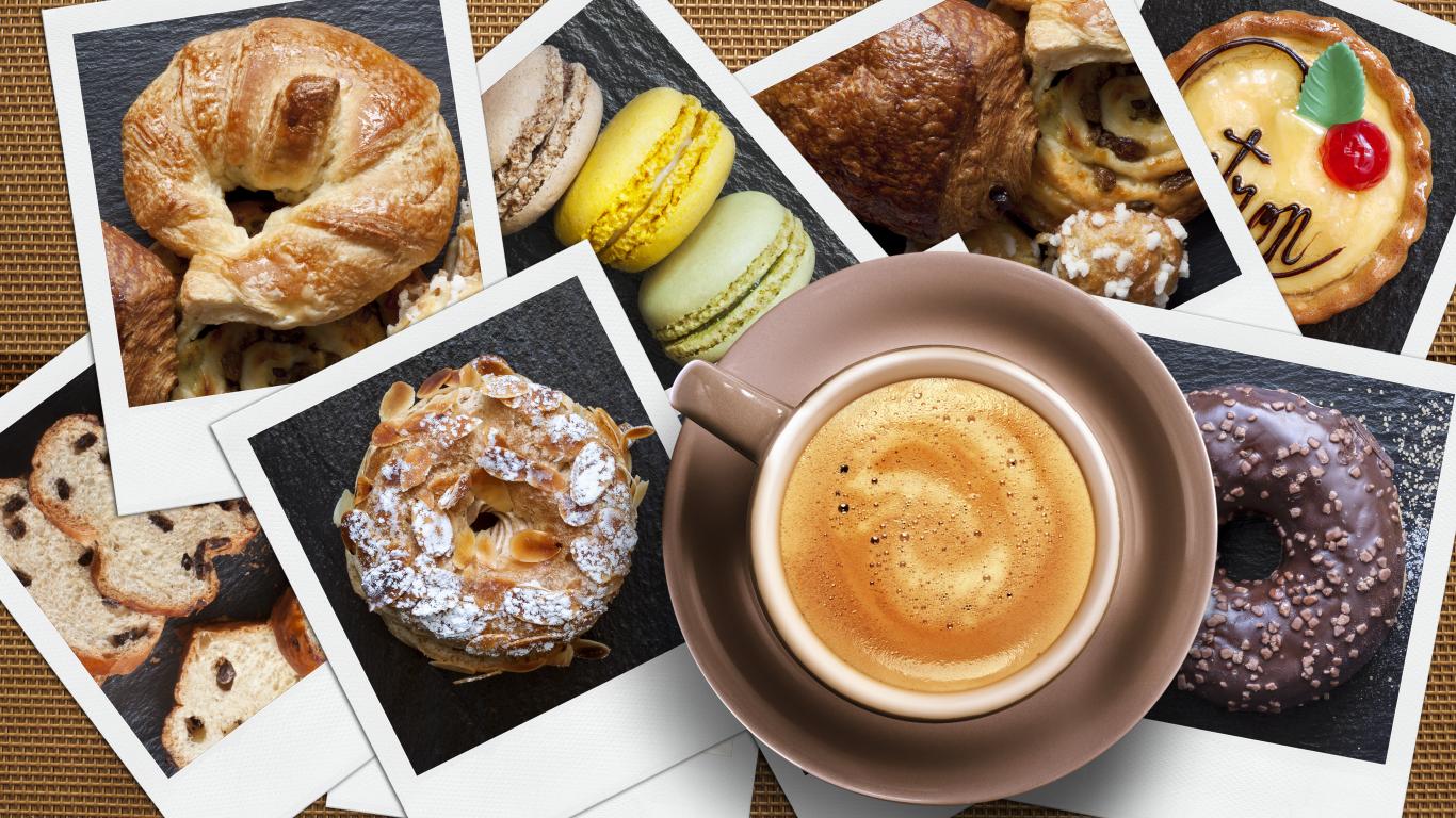 Wallpaper Cup of cappuccino on the table with a photo of desserts