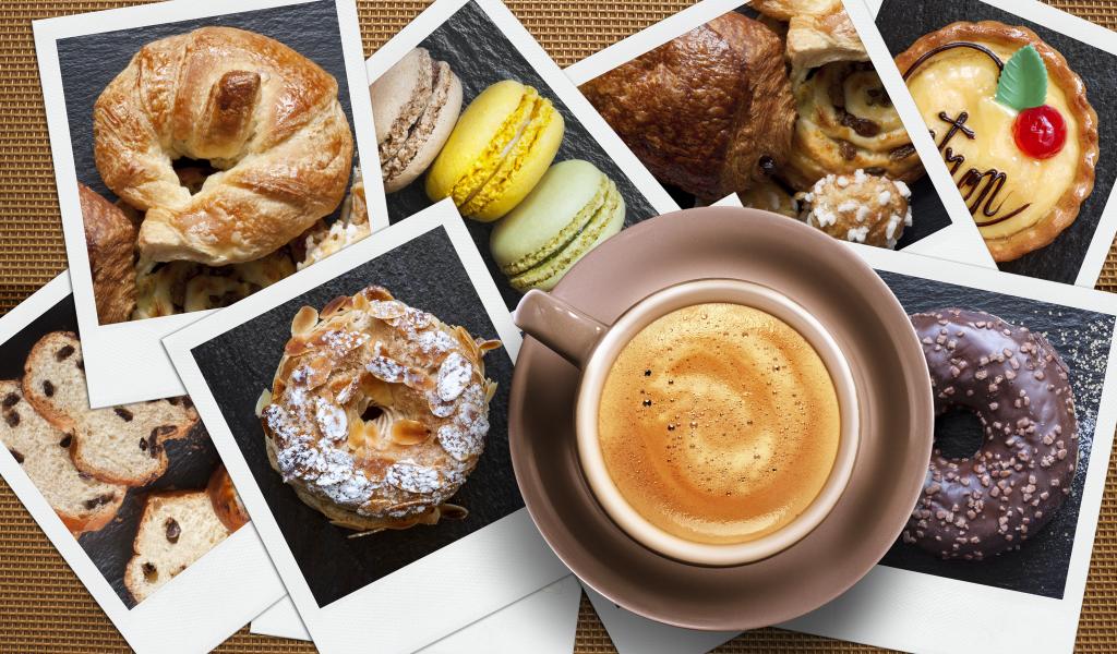 Wallpaper Cup of cappuccino on the table with a photo of desserts