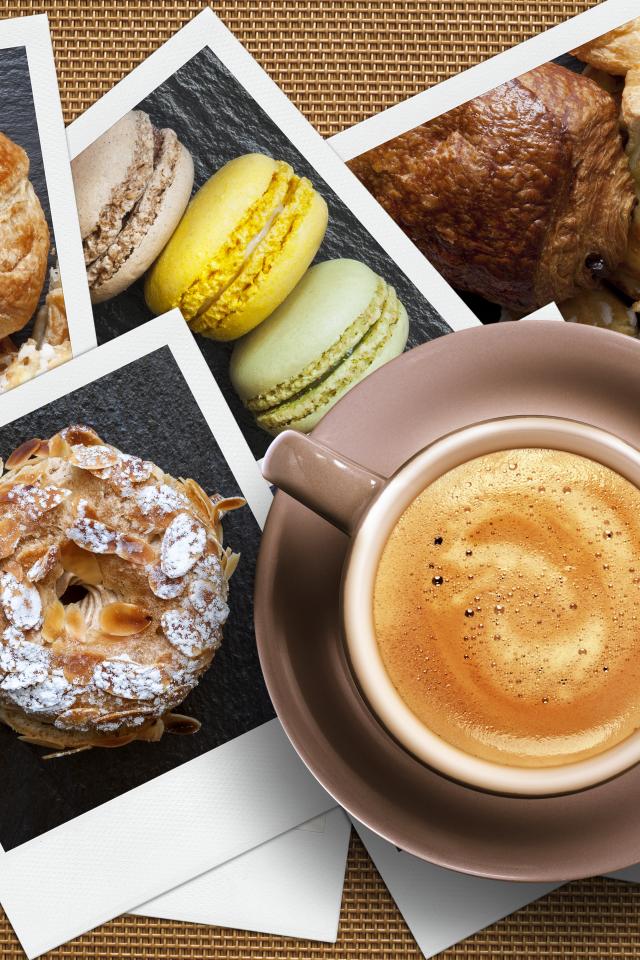 Wallpaper Cup of cappuccino on the table with a photo of desserts