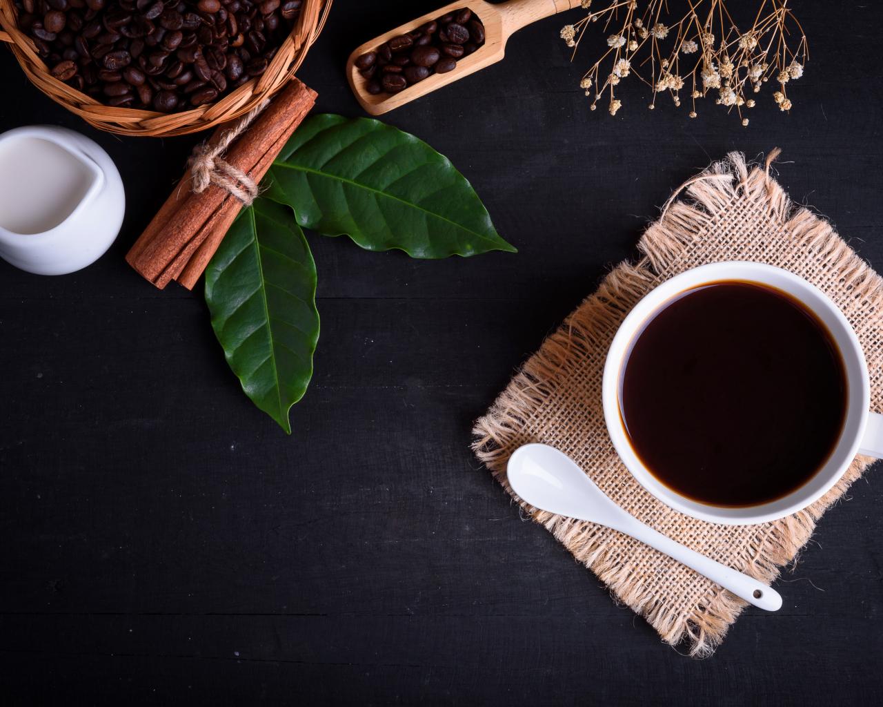Wallpaper Cup of coffee on a table with cinnamon and bay leaf