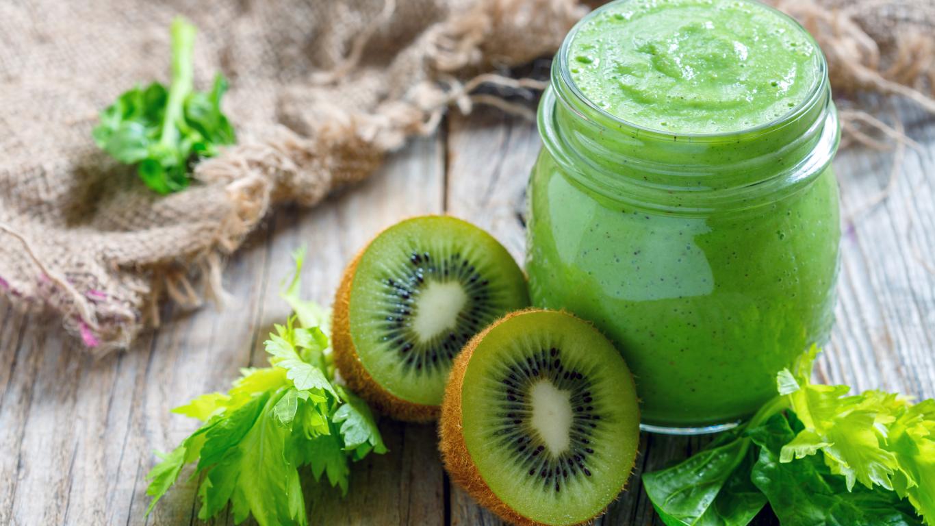 Wallpaper Green smoothie on a table with kiwi and herbs