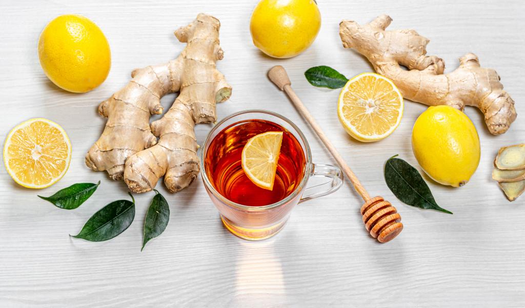 Wallpaper Tea in a glass cup on a table with lemon and ginger