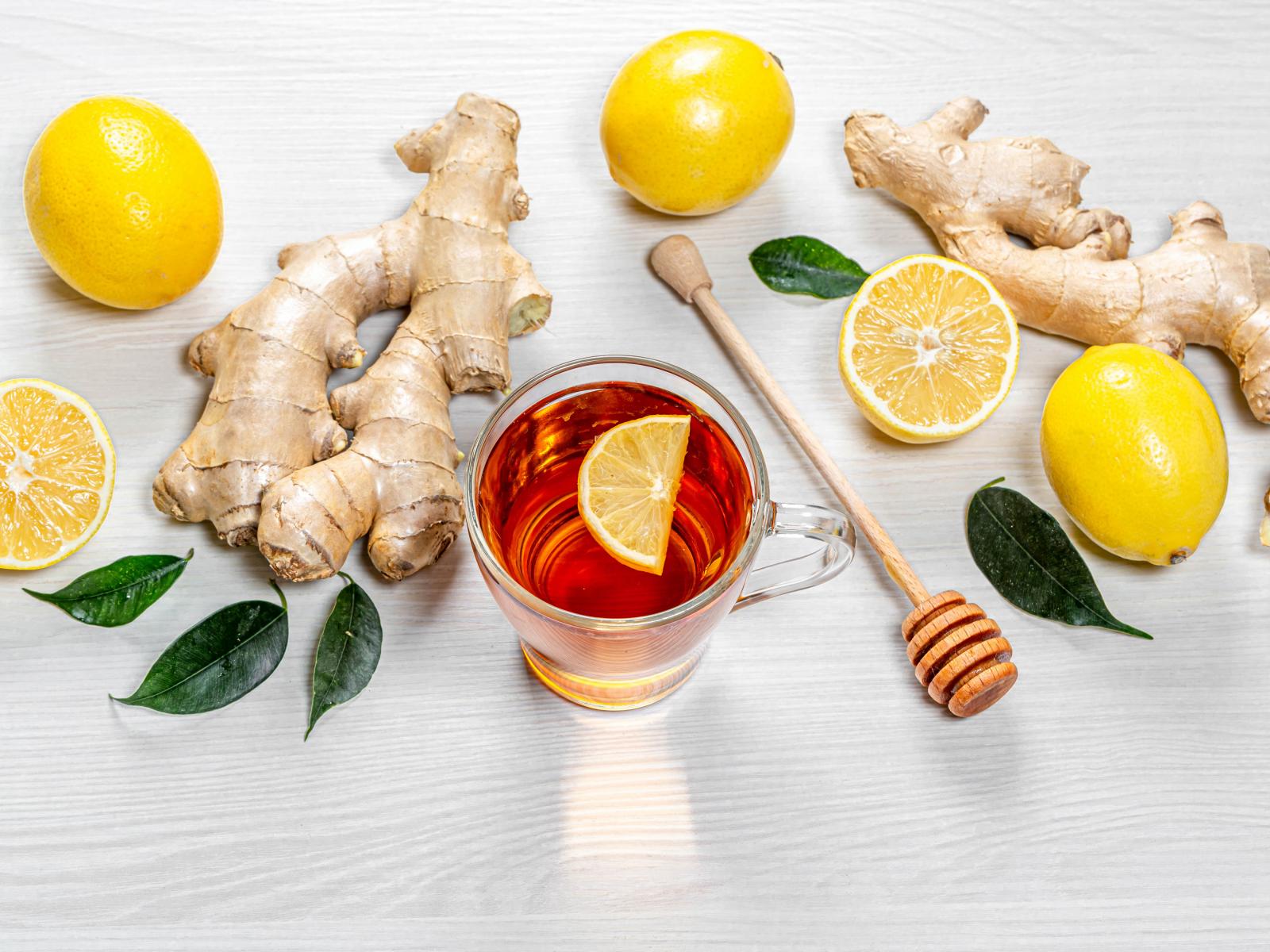 Wallpaper Tea in a glass cup on a table with lemon and ginger