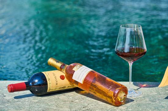 Wallpaper Two bottles of wine and a glass by the pool