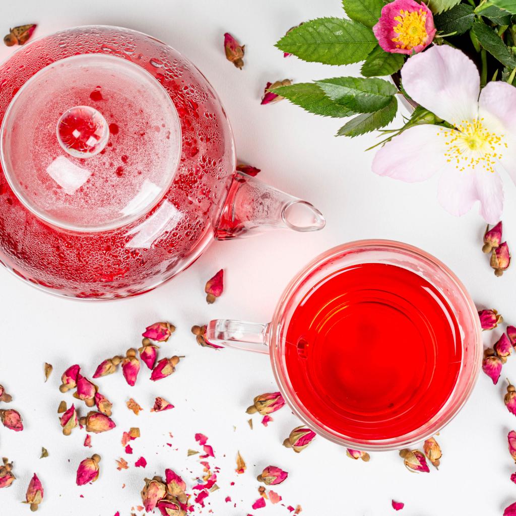 Wallpaper Fresh rosehip tea in a glass cup on a table with a teapot