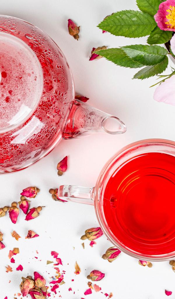 Wallpaper Fresh rosehip tea in a glass cup on a table with a teapot