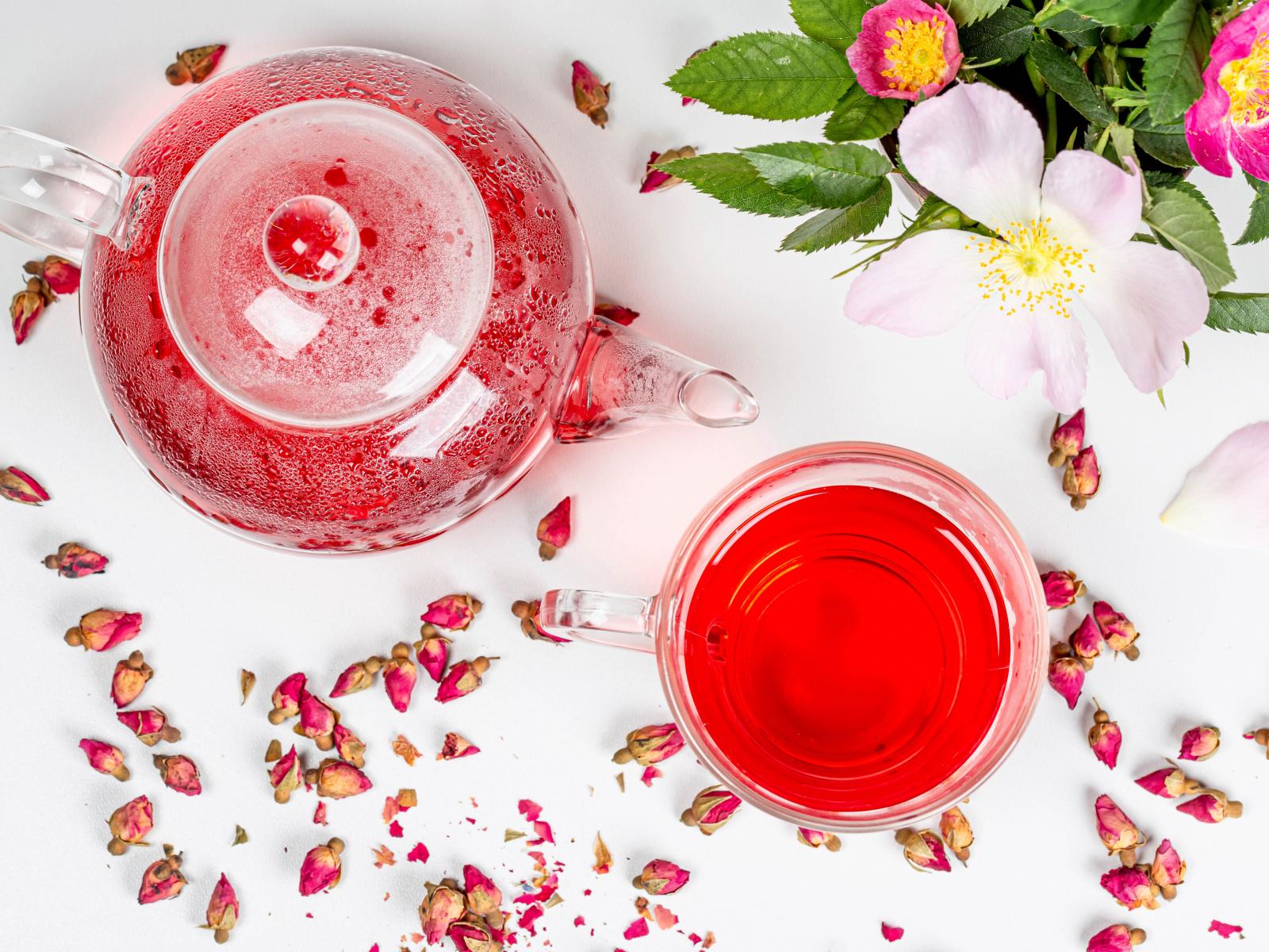 Wallpaper Fresh rosehip tea in a glass cup on a table with a teapot