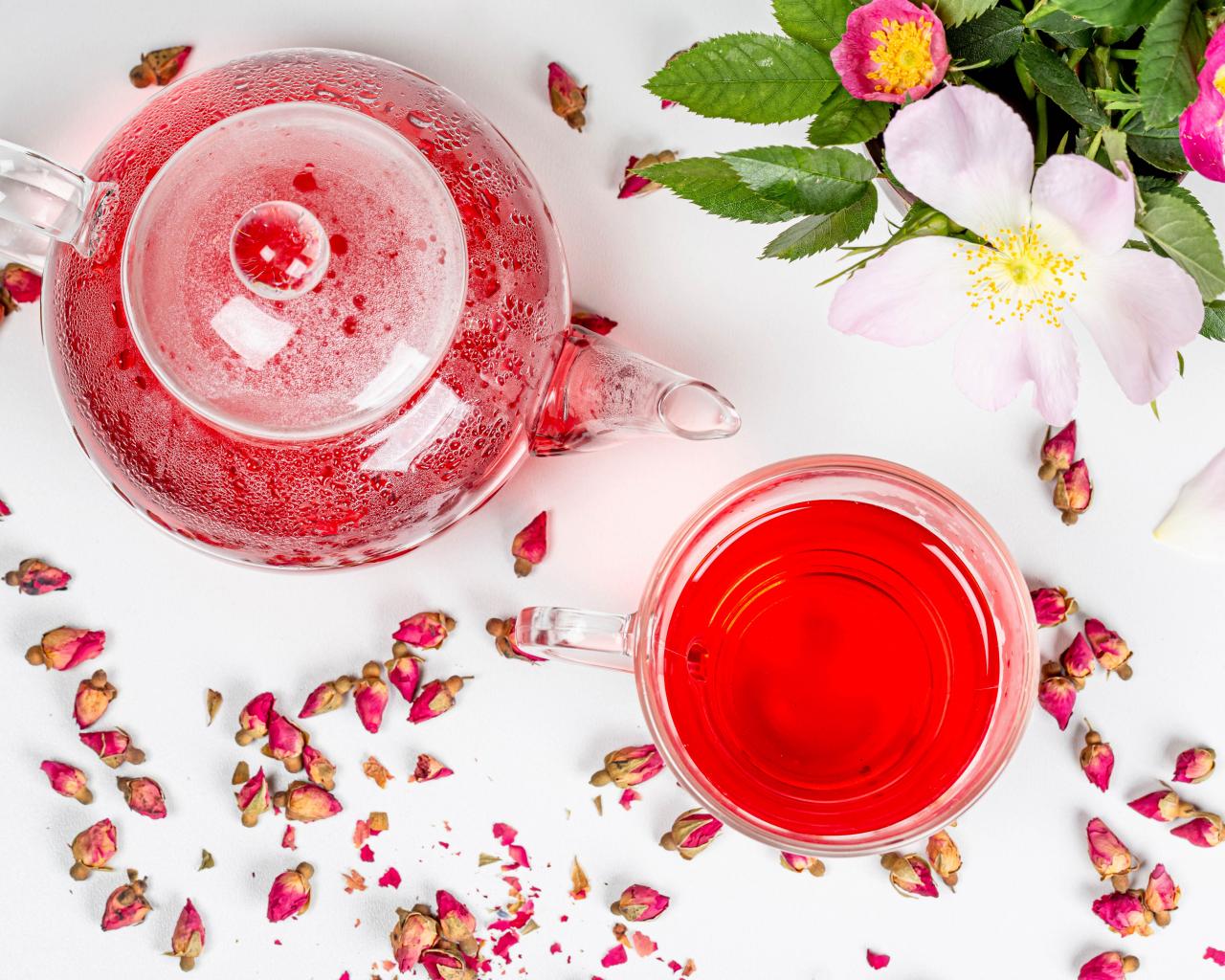 Wallpaper Fresh rosehip tea in a glass cup on a table with a teapot