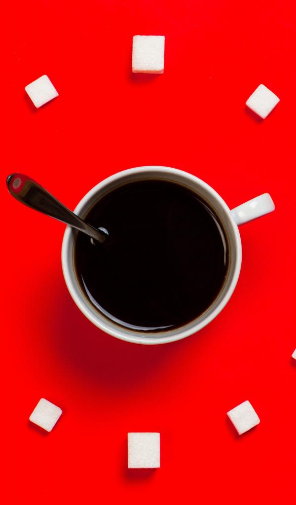 Wallpaper White cup of coffee on a red background with sugar cubes