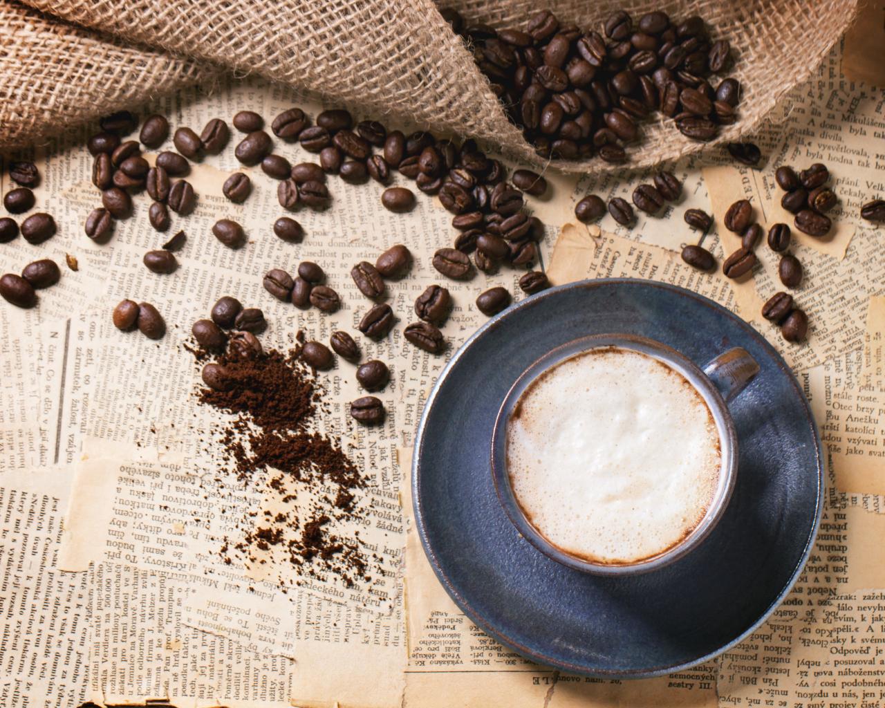 Wallpaper Cup of coffee on a table with old newspapers and grains