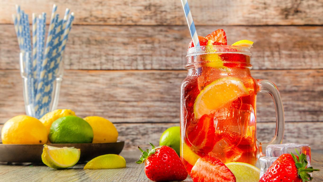 Wallpaper Drink with strawberries and lemon in a jar on the table