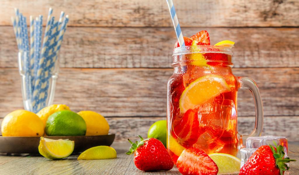 Wallpaper Drink with strawberries and lemon in a jar on the table