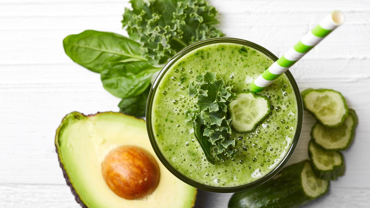 Wallpaper Green smoothie on a table with cucumber, avocado and herbs