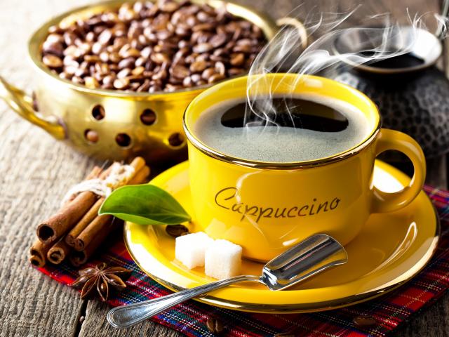 Wallpaper Yellow cup with hot coffee on a table with grains and cinnamon
