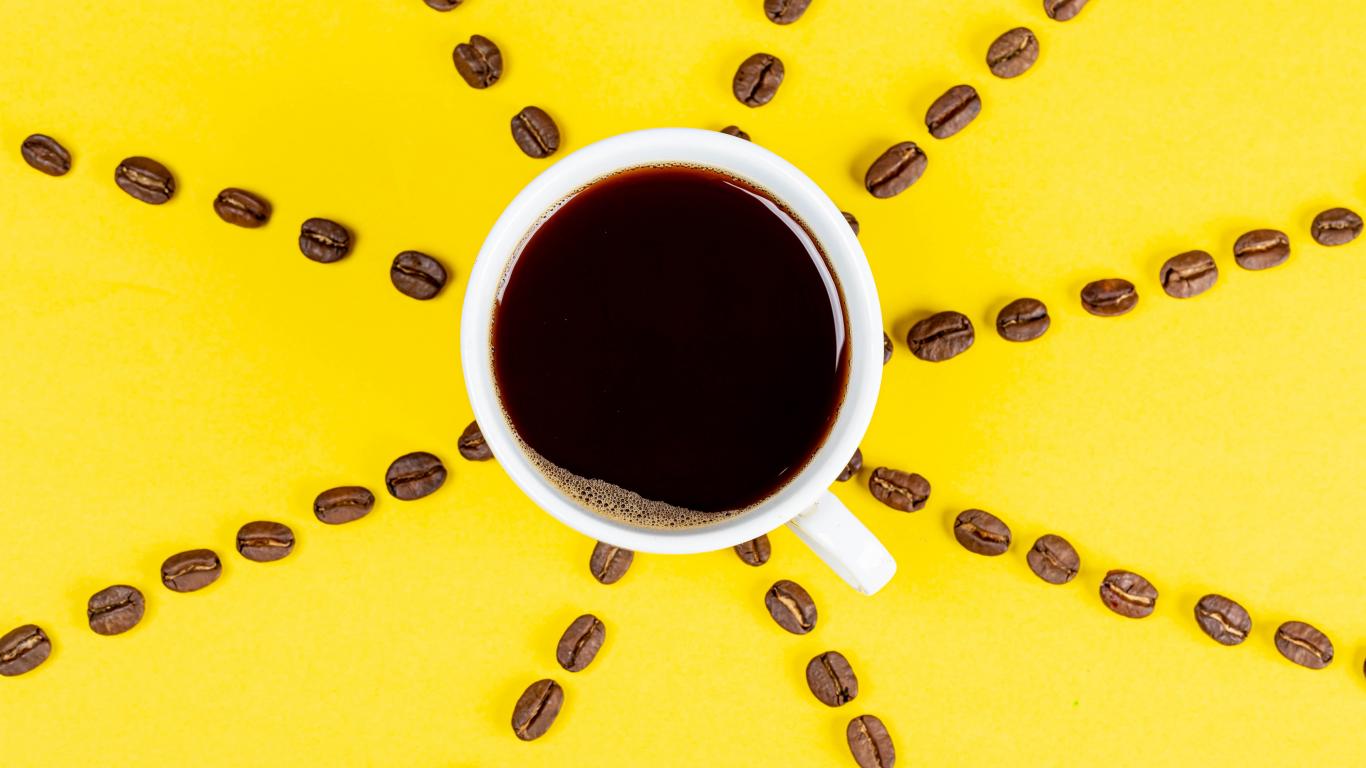 Wallpaper The sun from a cup of coffee with grains on a yellow background