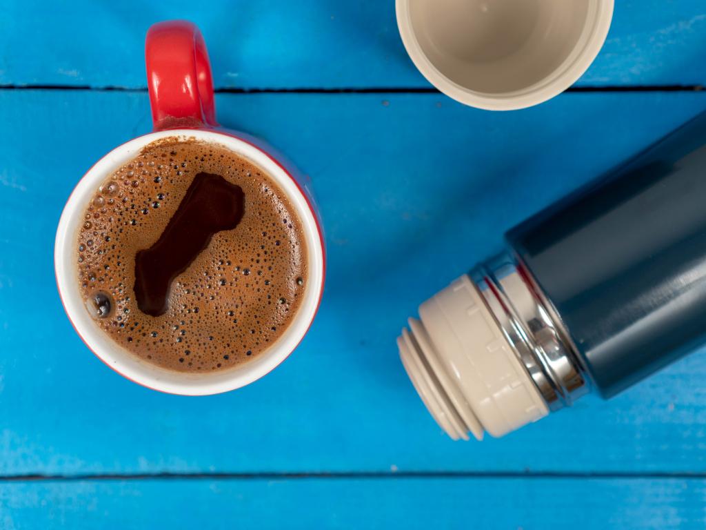 Wallpaper Red cup of coffee with a thermos on a blue table