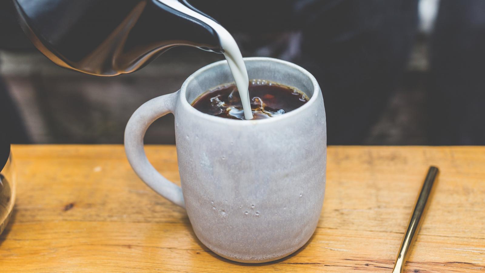 Wallpaper Hot coffee is poured into a white cup on a table with coffee beans.