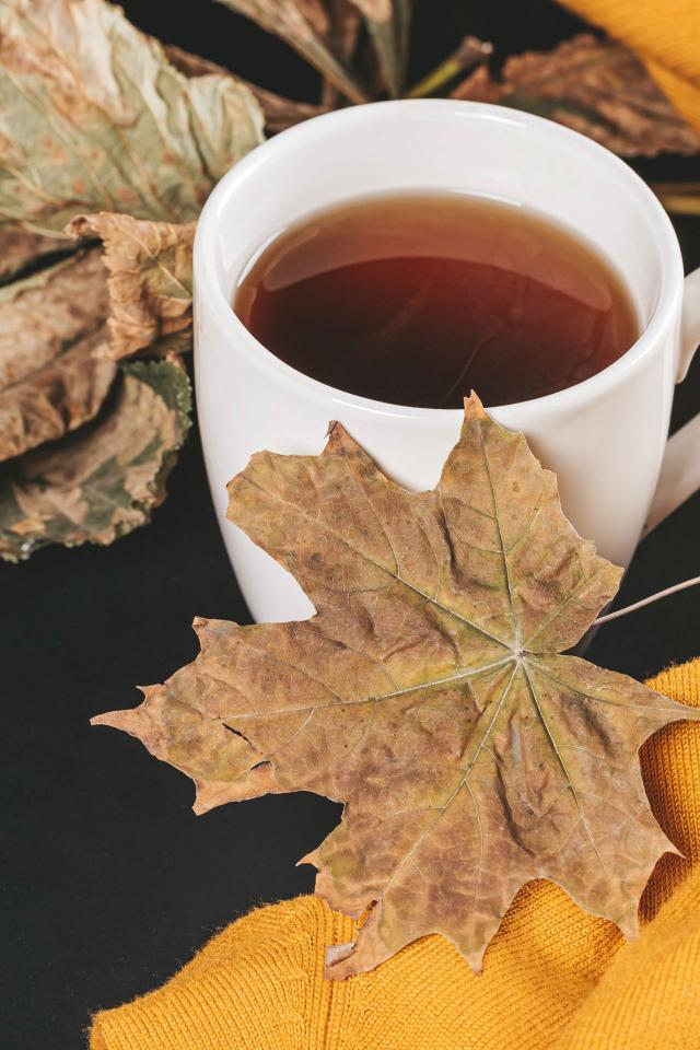 Wallpaper Cup of hot tea on the table with dry leaves