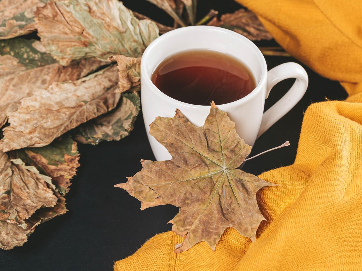 Wallpaper Cup of hot tea on the table with dry leaves