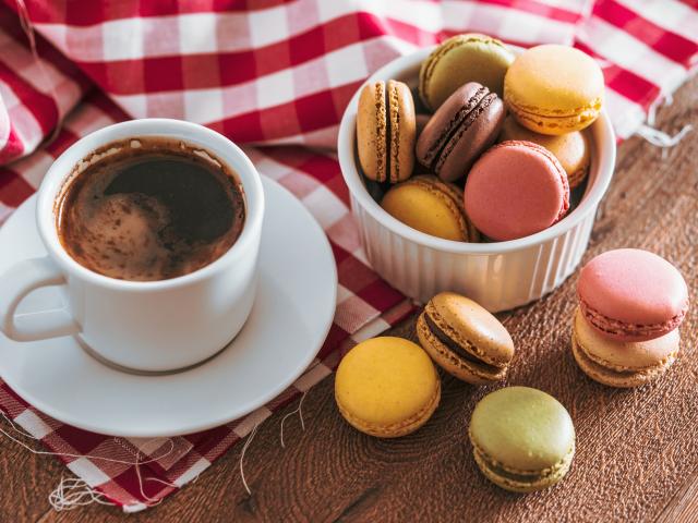 Wallpaper Cup of coffee on the table with macaroon dessert