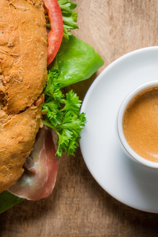 Wallpaper Cup of coffee with a sandwich on the breakfast table