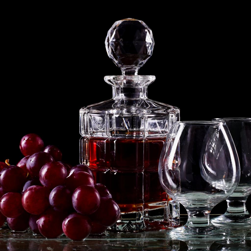 Wallpaper Decanter with cognac on the table with glasses and grapes