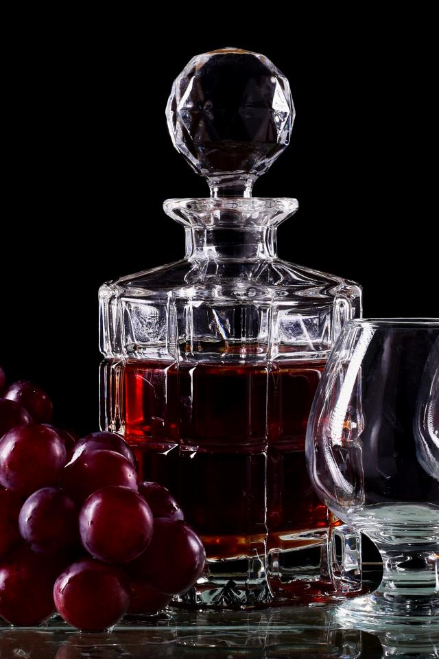 Wallpaper Decanter with cognac on the table with glasses and grapes
