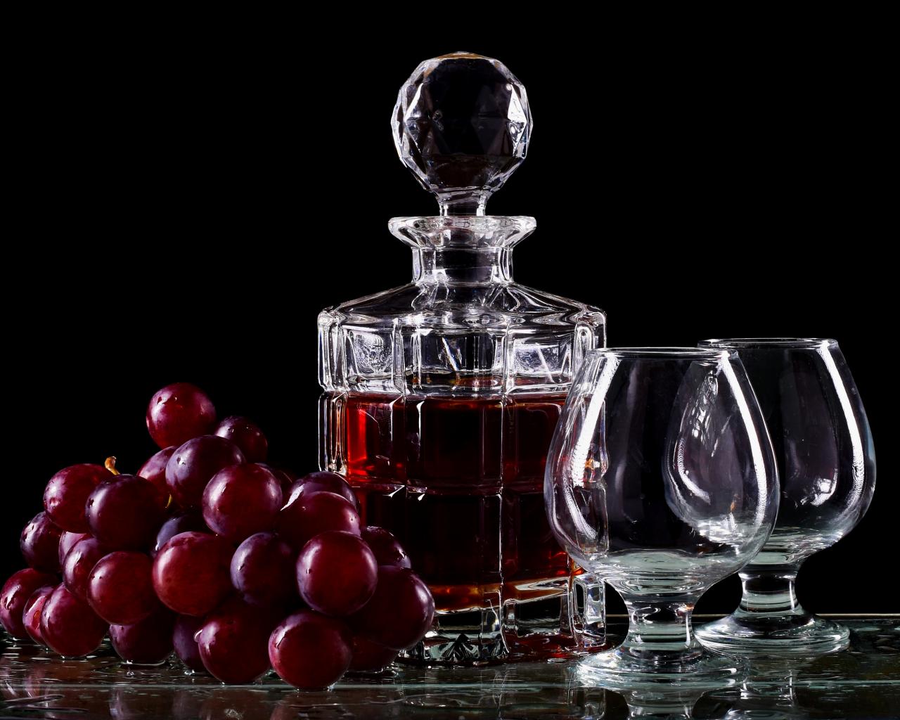 Wallpaper Decanter with cognac on the table with glasses and grapes